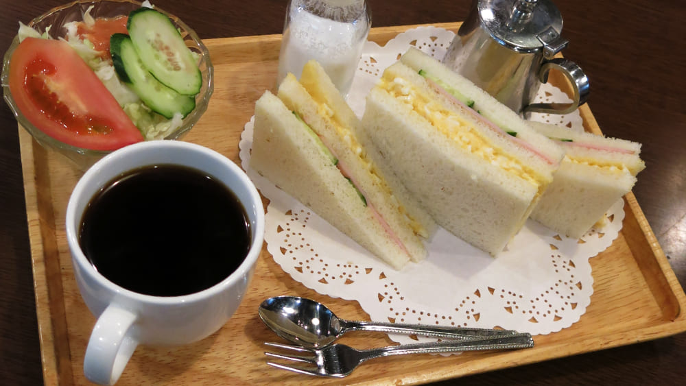 モーニングの提供時間は8:30~11:30とうれしいロングタイム。朝のんびり起きてもモーニングが楽しめるのは最高ですよね。トーストやホットドック、ワッフルのモーニングセットと8種ものラインナップがあるなか、王道の「サンドウィッチセット」をチョイスしました。